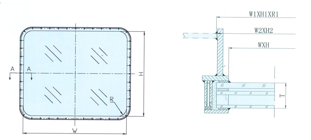 | WxHxR nominal size | W2xH2xR2 external size | W1xH1xR1 opening size of bulkhead | T glass thickness | ||||