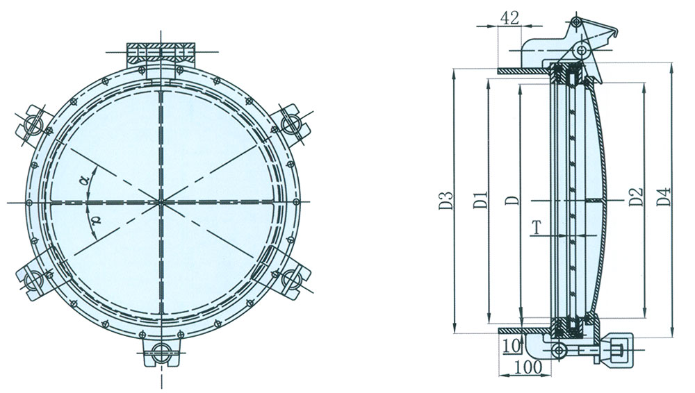 | 透光尺寸D | D1 | D2 | D3 | D4 | α | 紧固件数量 | 玻璃厚度 | 围壁开口尺寸 | 螺栓数量 | |